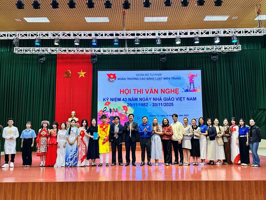 Tối ngày 18/11/2025, Đoàn Trường Cao đẳng Luật Miền Trung long trọng tổ chức Hội thi văn nghệ chào mừng 43 năm Ngày Nhà giáo Việt Nam (20/11/1982 – 20/11/2025). Chương trình là hoạt động ý nghĩa nhằm tri ân các thầy cô giáo, tạo không khí vui tươi, đoàn kết trong toàn trường.